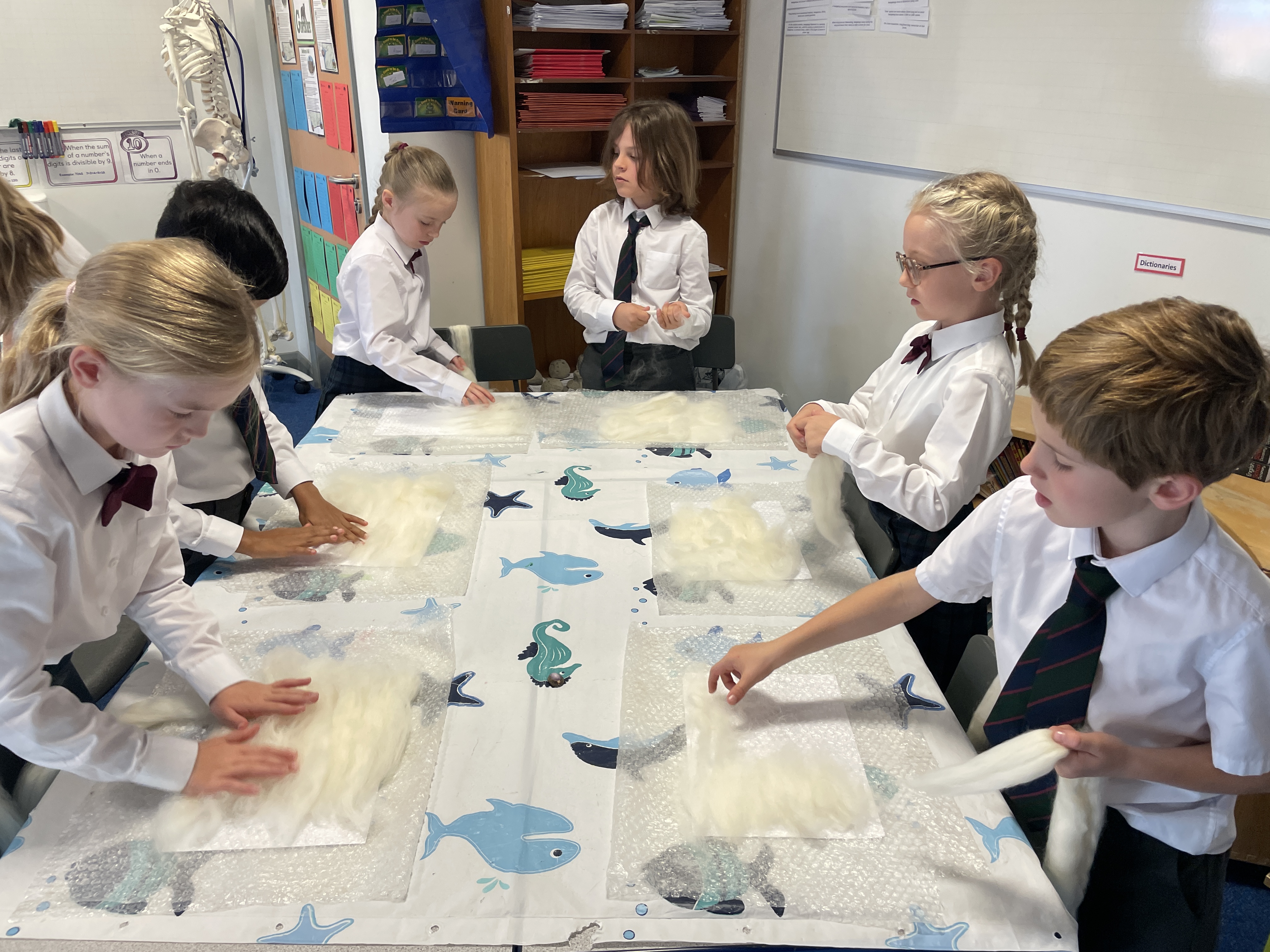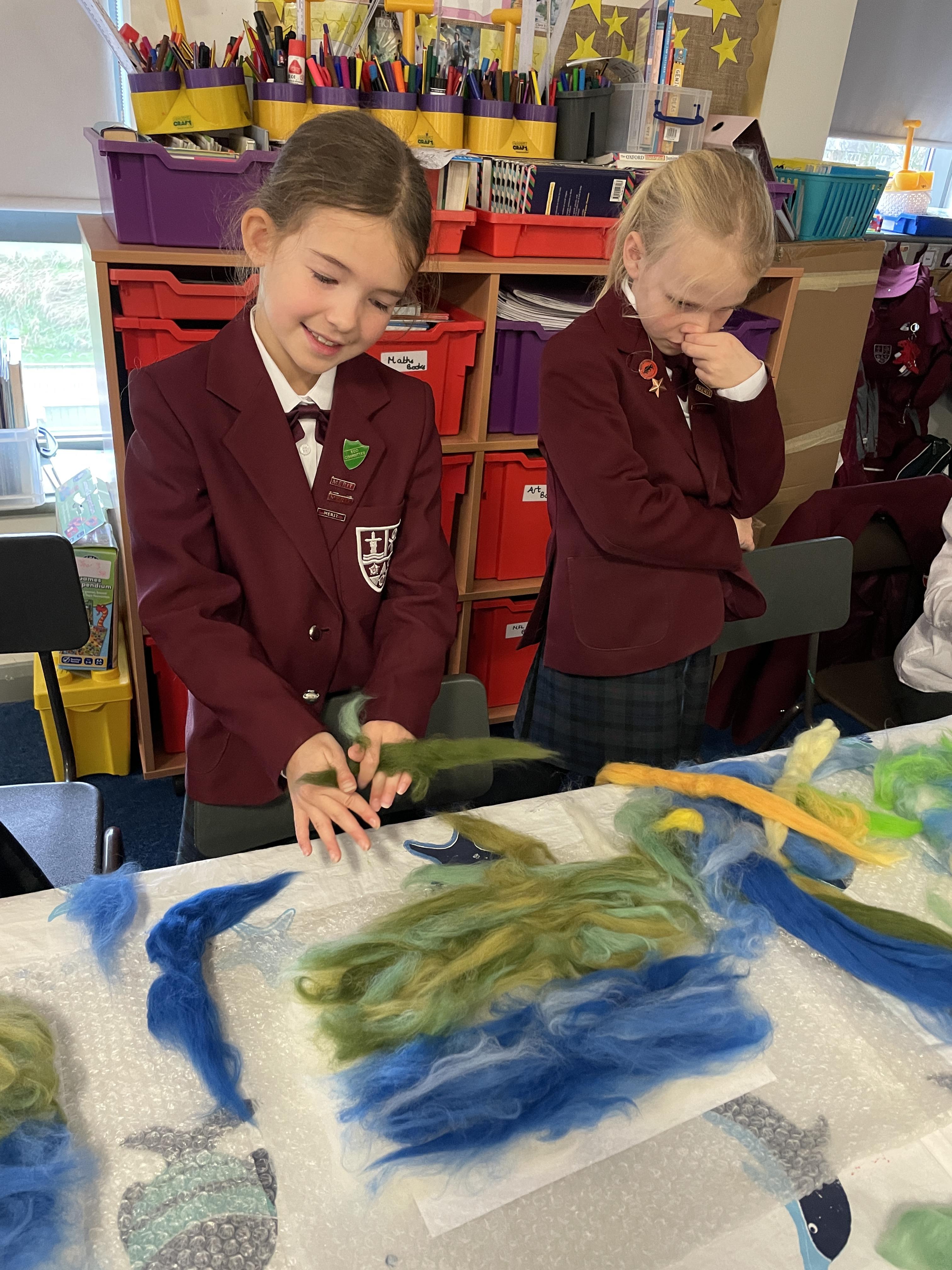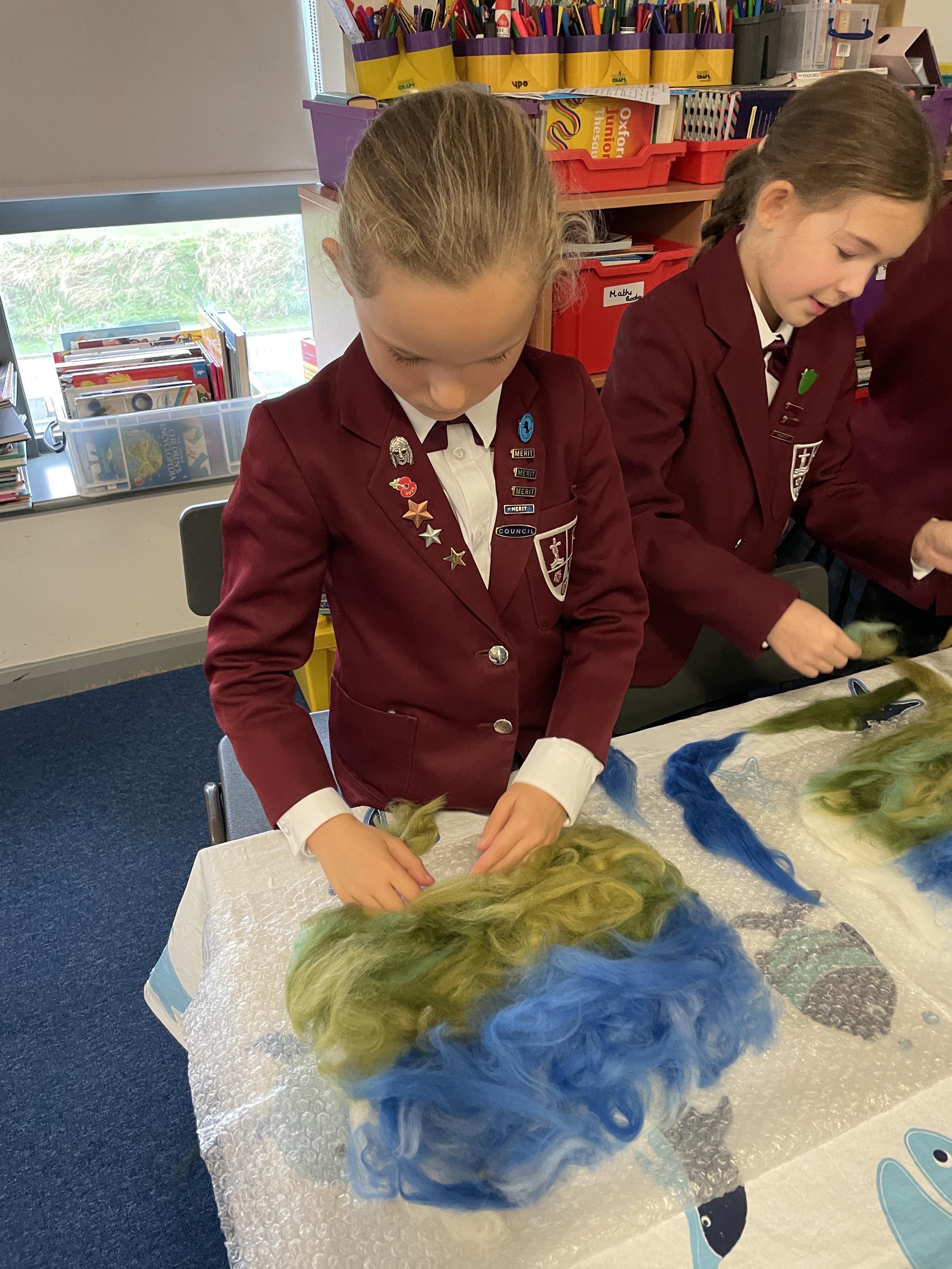 The workshops began with Gill explaining that felt is created from sheep’s fleece. She showed the children examples of her work from previous workshops, as well as pieces she makes for craft fairs. The children also practised transforming light, airy sheep’s wool into a felted bead by rubbing and rolling the wool between their hands.