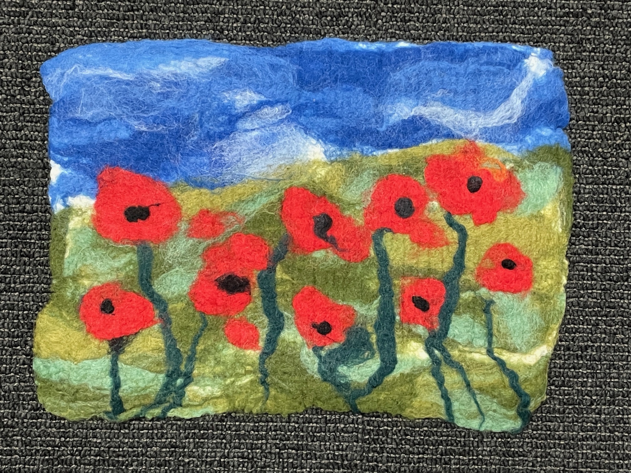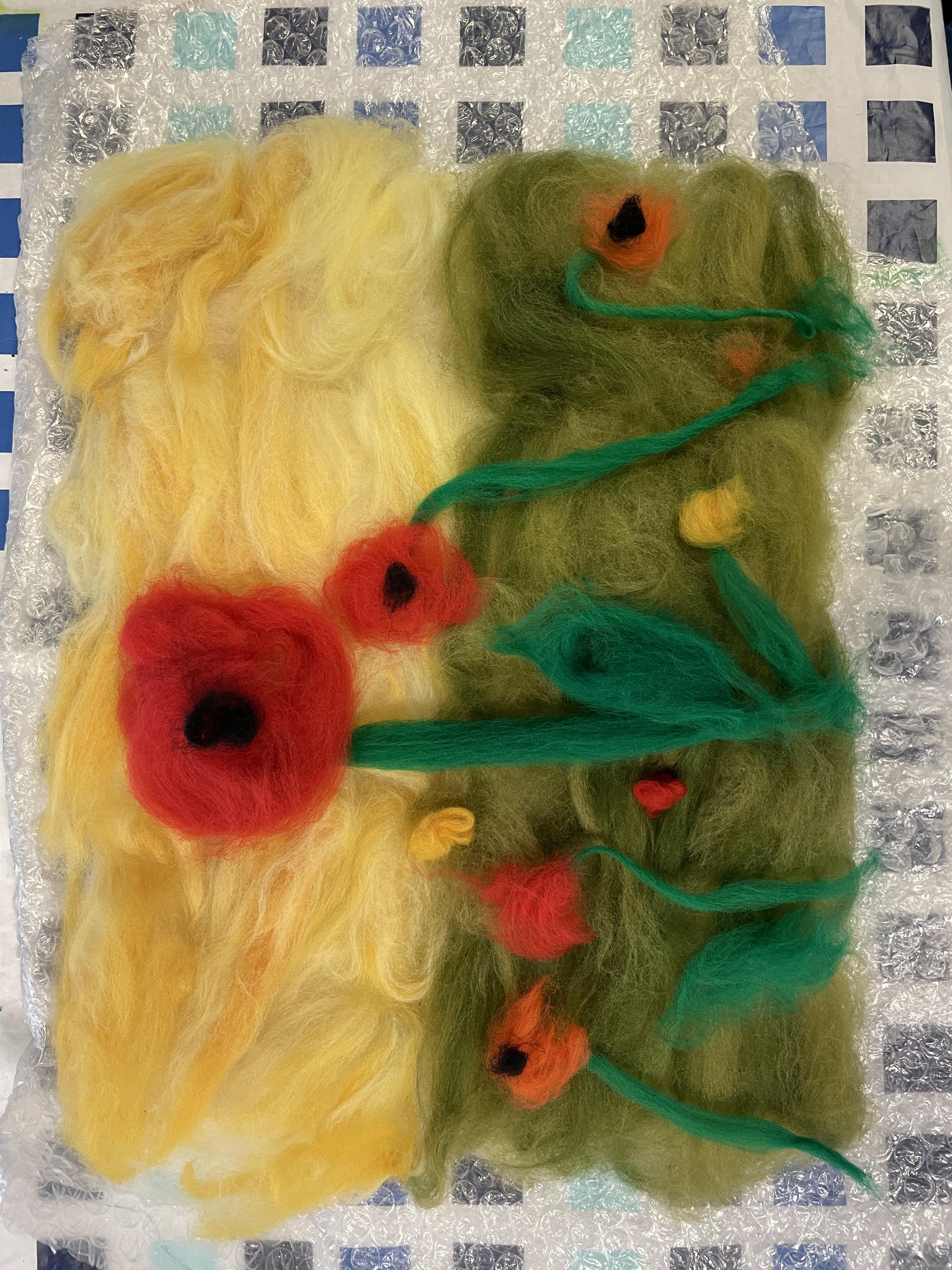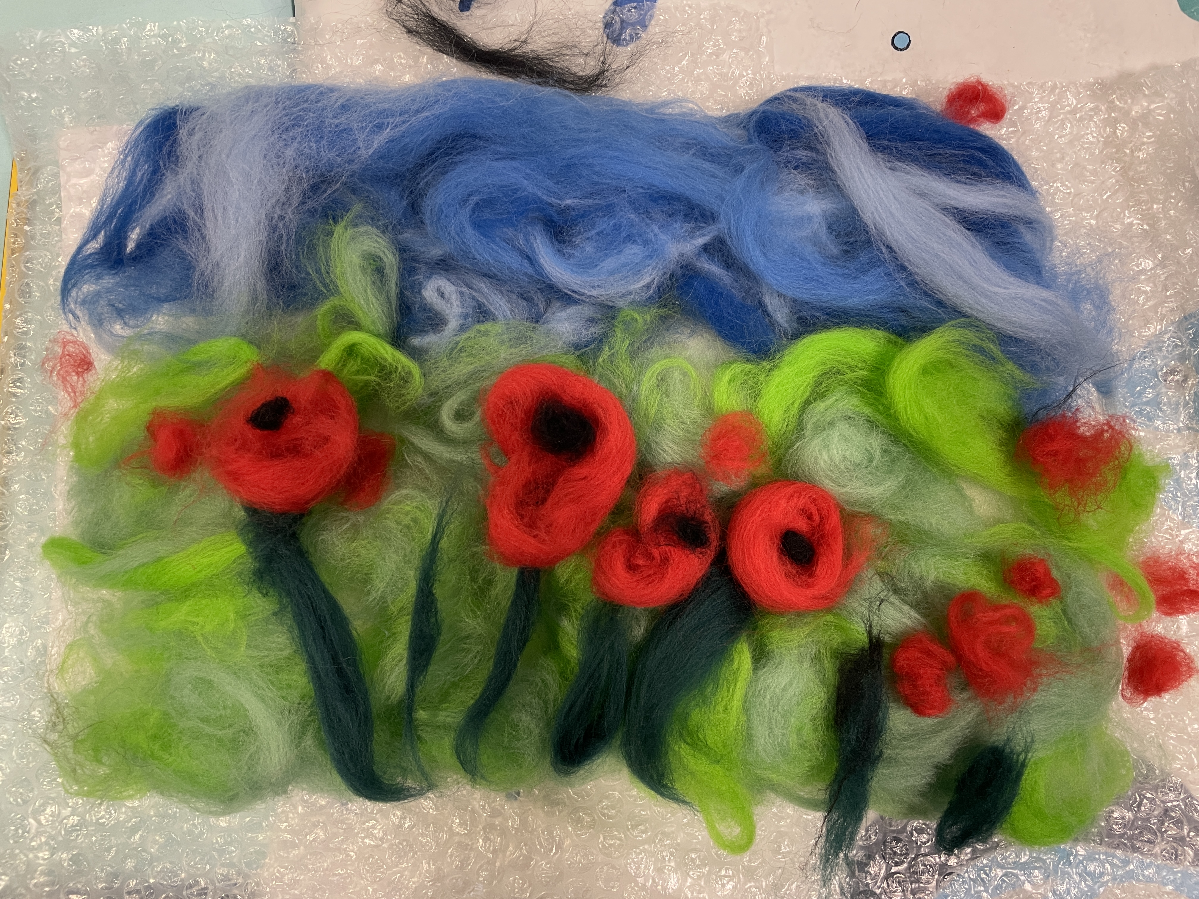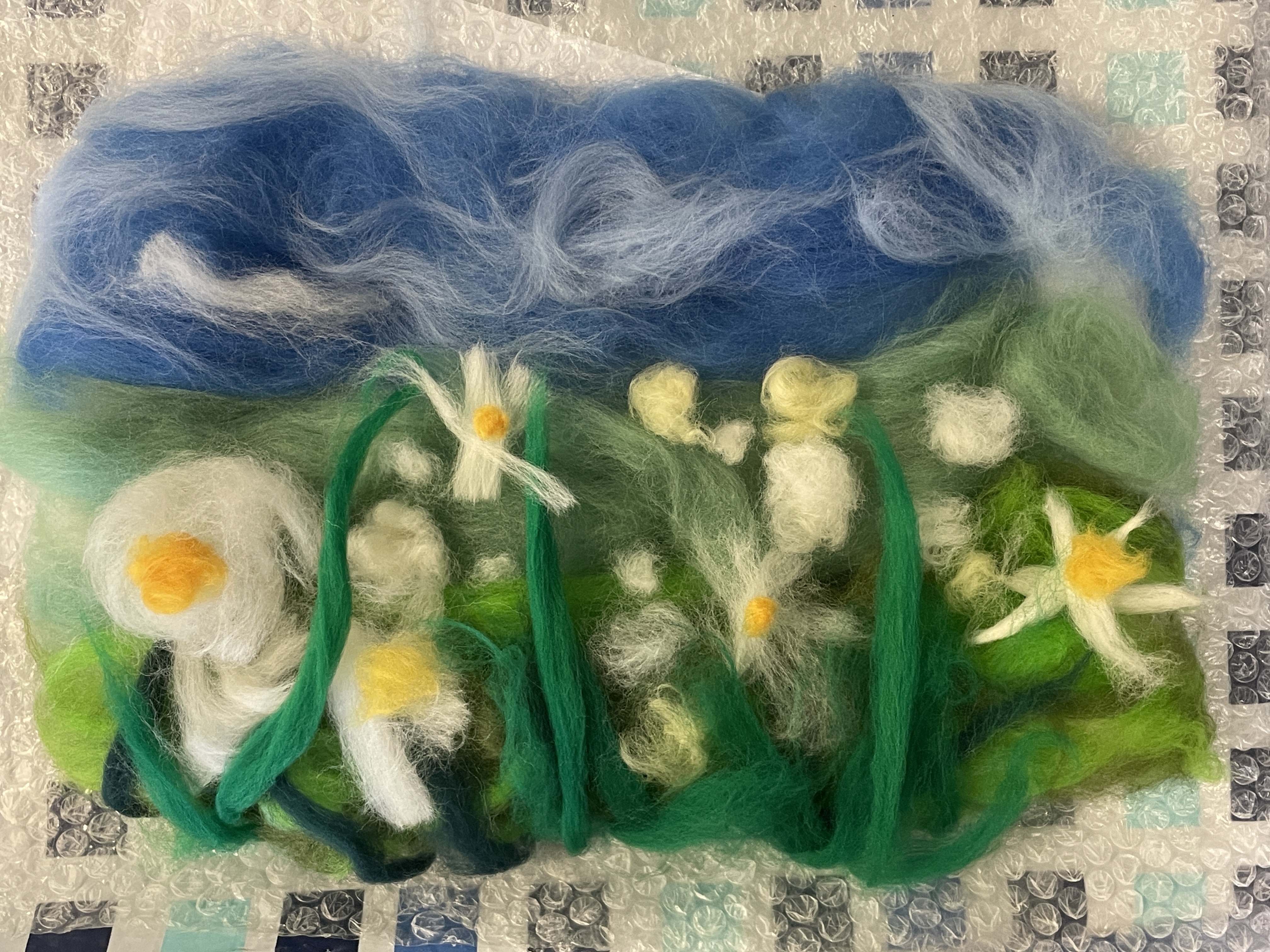 Next, they used coloured felt to form their sky and foreground, blending colours and splitting the wool with “soft hands”.