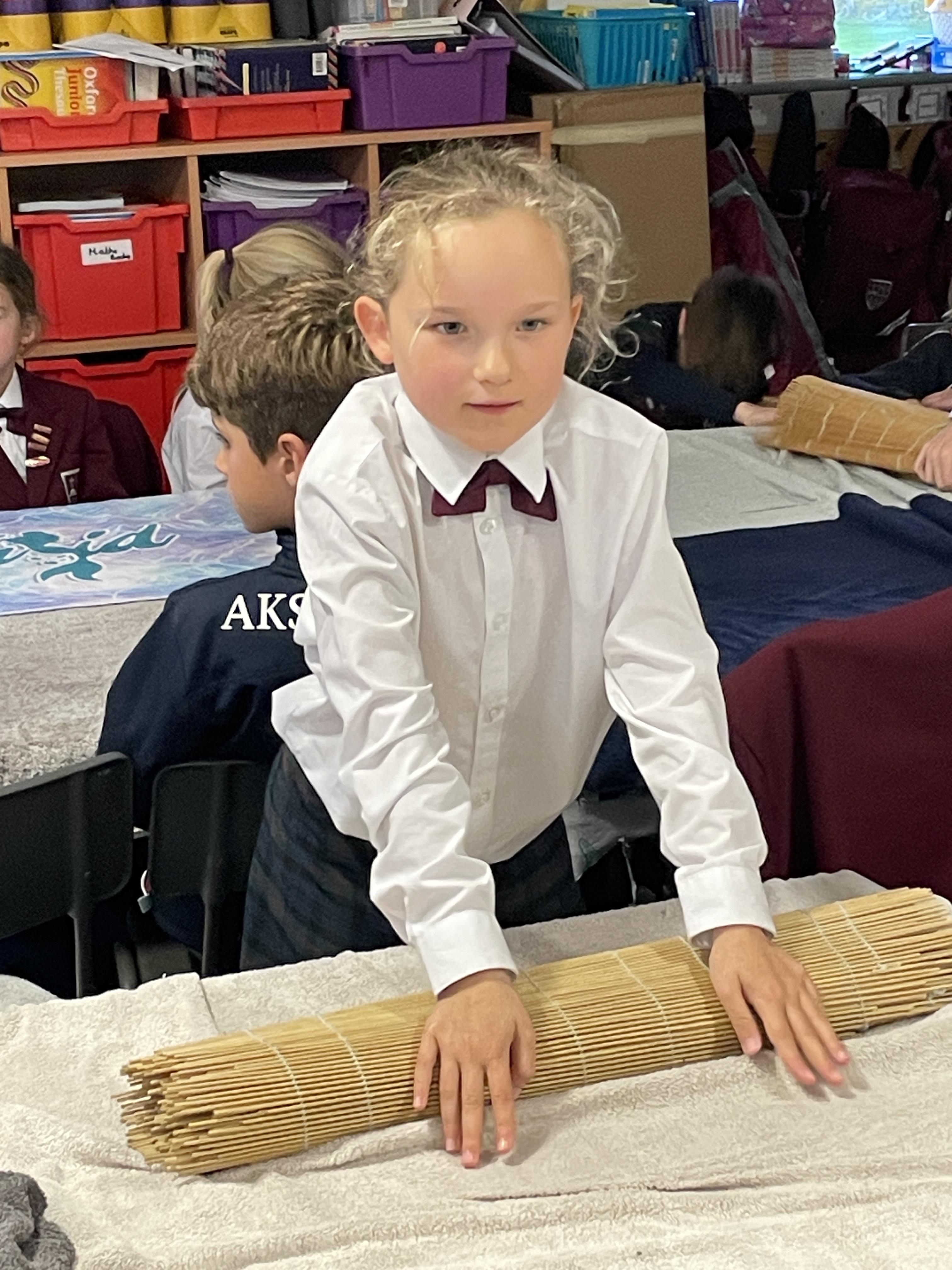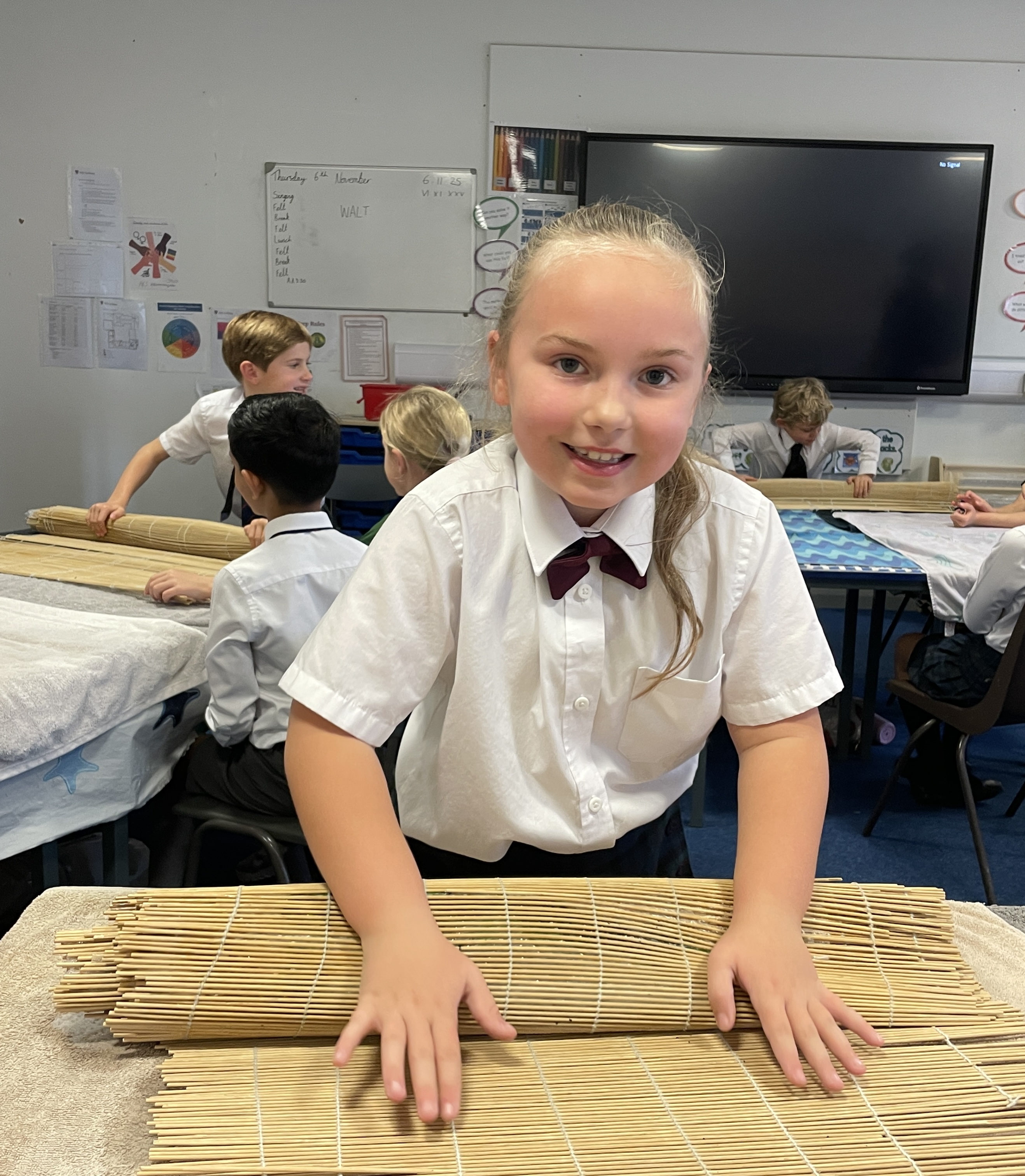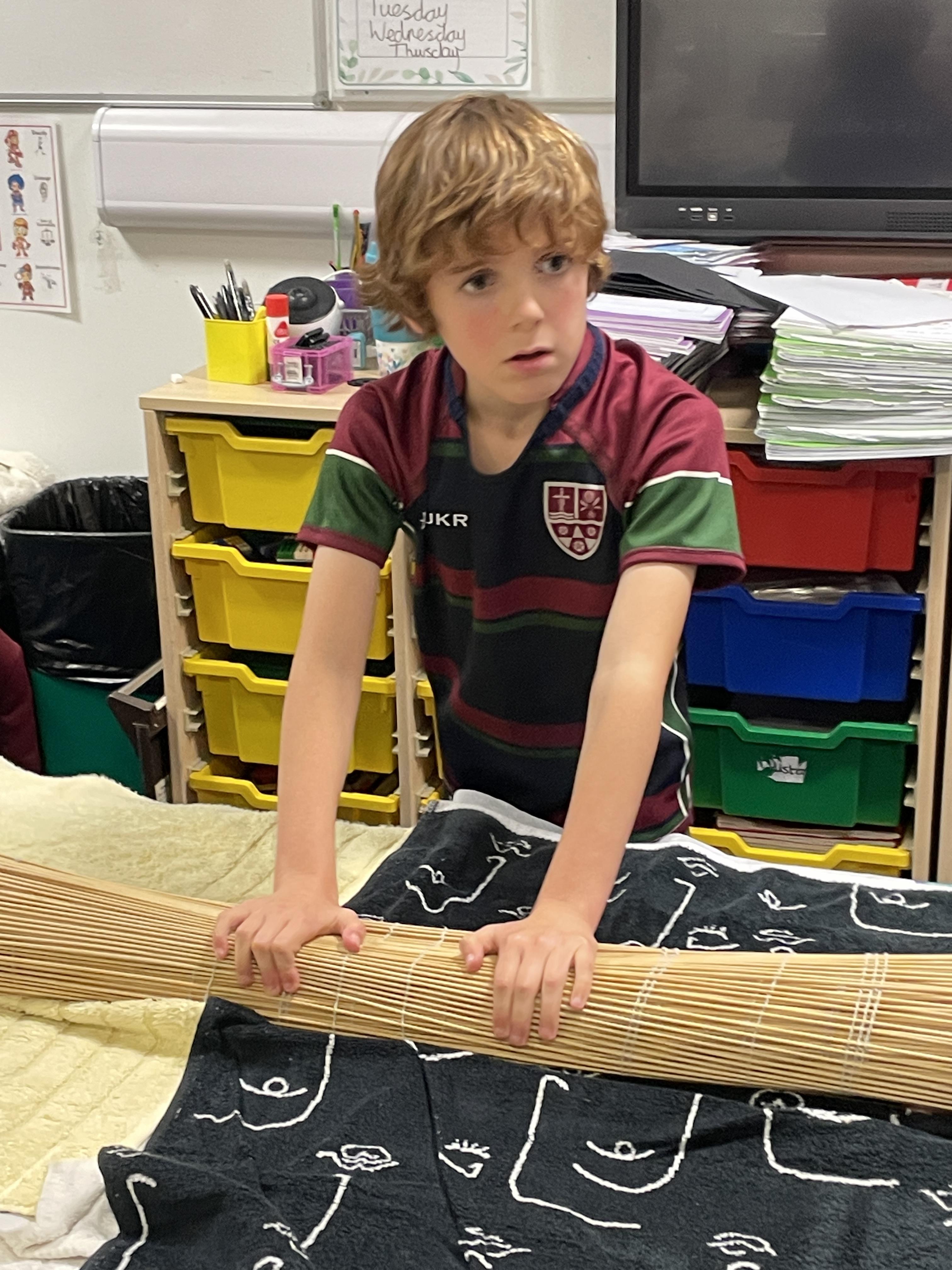 After lunch, the children worked in groups to transform their fluffy pictures into felt. To do this, they first had to “wet and then set” their pictures by adding water and pressing down with their hands. Once the pieces were wet, they were rolled inside large bamboo blinds. Each child completed one hundred rolls while the rest of the class counted. This pressure from rolling and pressing bonds the wool fibres and fixes the pieces together.