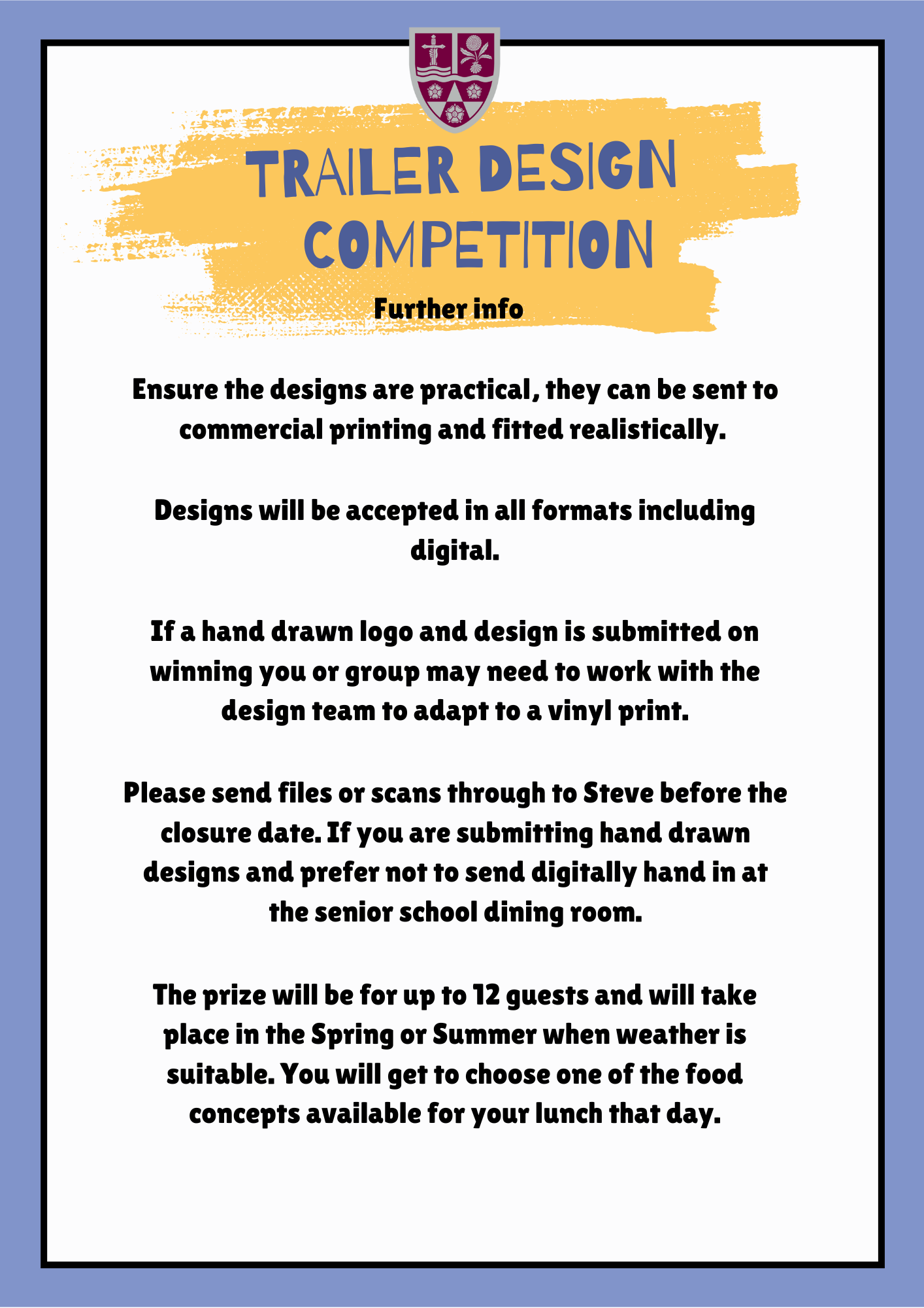 Designs can be hand-drawn or created digitally, and entries may be submitted individually or in groups. Two winning designs — one for each side of the trailer — will be selected by the school marketing team based on creativity and originality.