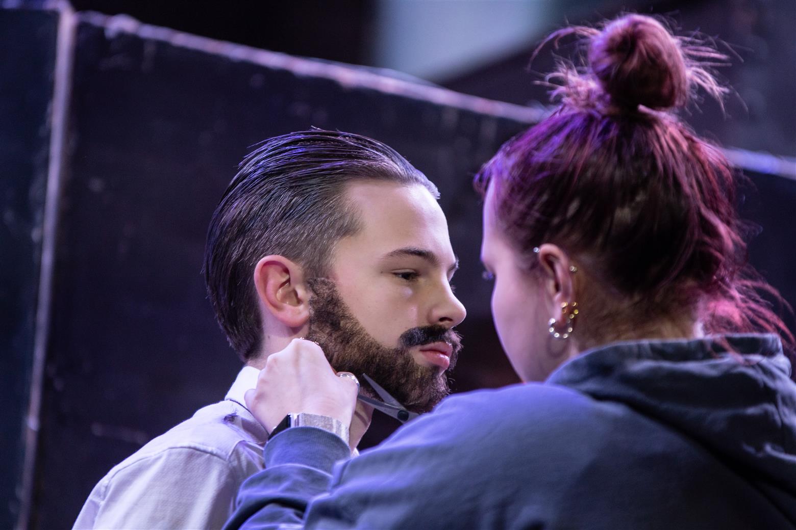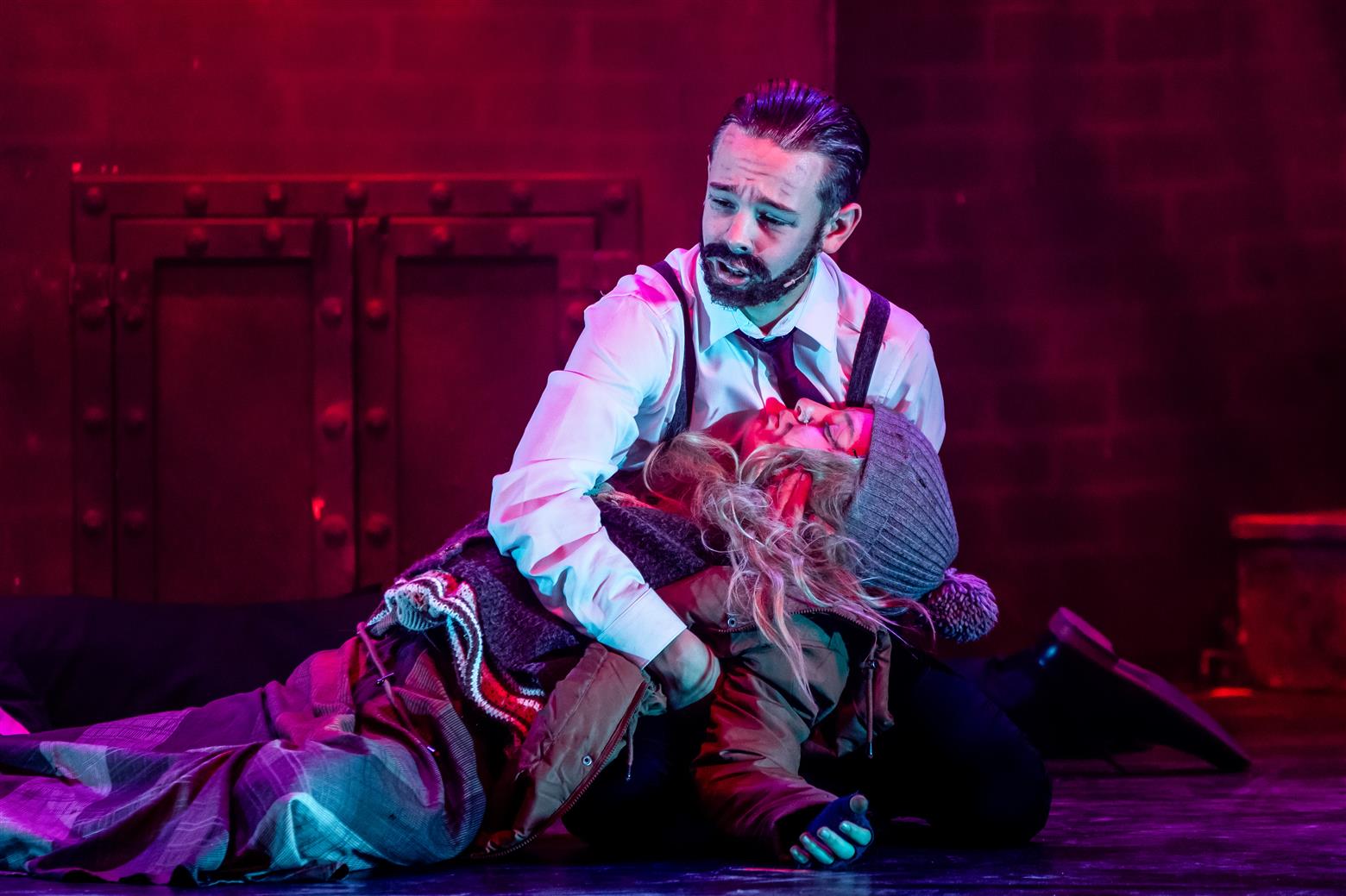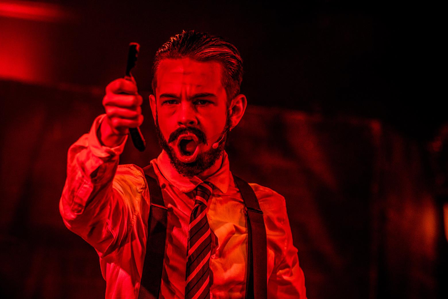 Judge Turpin (Finlay Law) clad in his smart suit and sporting some amazing Seventies’ sideboards talked in a guttural Glaswegian that put me visually and aurally in mind of Glasgow shop-steward Jimmy Reid railing against Ted Heath’s government (do feel free to look up these arcane references). But unlike the dockers’ champion, Judge Turpin is a monstrous capitalist and all-round exploiter of, well, practically everyone. And every villain needs a side-kick. Enter the oleaginous Beadle Bamford, played by Jacob Beverley, slithering around the stage in fawn mac and speaking in low voice of menace. Jacob seems to have cornered the market in creepy fawning characters (and why not? Someone’s got to do it). Don’t worry – they get what’s coming to them via Sweeney’s rough justice, though Turpin has a lucky escape first time round when, Hamlet-like, Sweeney seems to have a pang of conscience when he has the lawman in the chair to be shaved – perhaps being suckered into tenderness by the judge’s reminiscences of the songs of his youth.