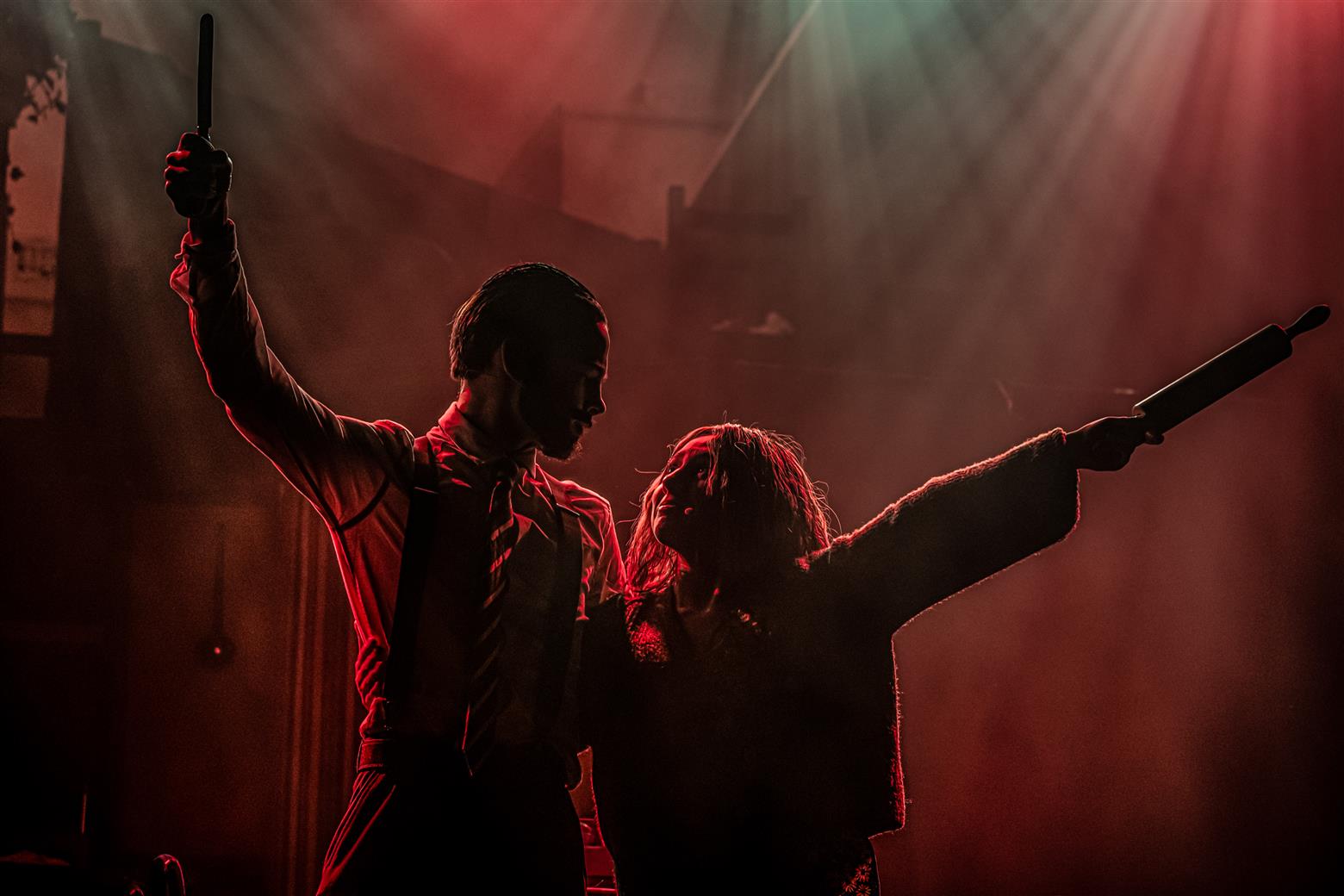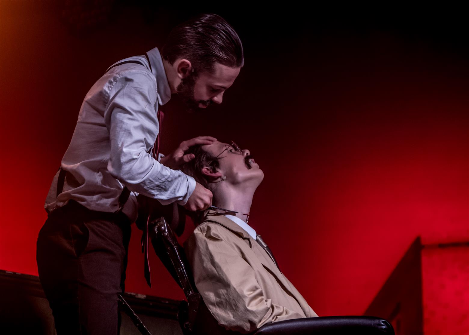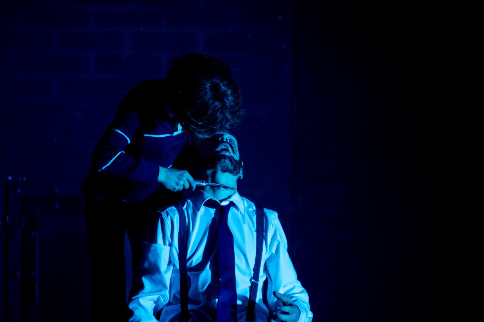 Judge Turpin (Finlay Law) clad in his smart suit and sporting some amazing Seventies’ sideboards talked in a guttural Glaswegian that put me visually and aurally in mind of Glasgow shop-steward Jimmy Reid railing against Ted Heath’s government (do feel free to look up these arcane references). But unlike the dockers’ champion, Judge Turpin is a monstrous capitalist and all-round exploiter of, well, practically everyone. And every villain needs a side-kick. Enter the oleaginous Beadle Bamford, played by Jacob Beverley, slithering around the stage in fawn mac and speaking in low voice of menace. Jacob seems to have cornered the market in creepy fawning characters (and why not? Someone’s got to do it). Don’t worry – they get what’s coming to them via Sweeney’s rough justice, though Turpin has a lucky escape first time round when, Hamlet-like, Sweeney seems to have a pang of conscience when he has the lawman in the chair to be shaved – perhaps being suckered into tenderness by the judge’s reminiscences of the songs of his youth.