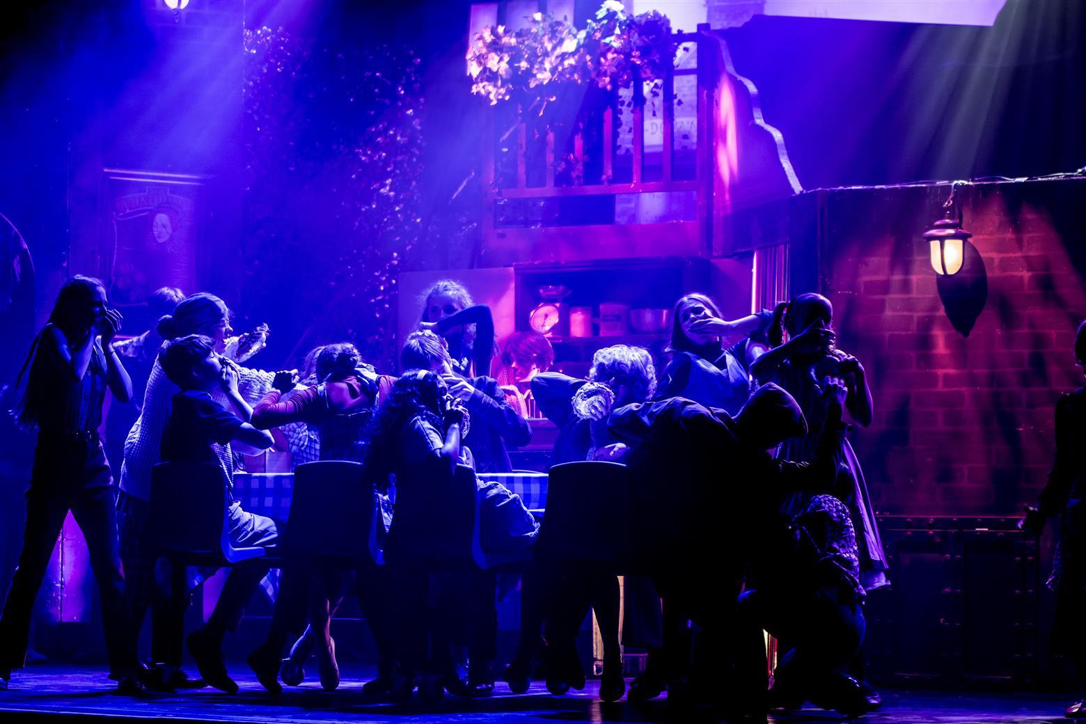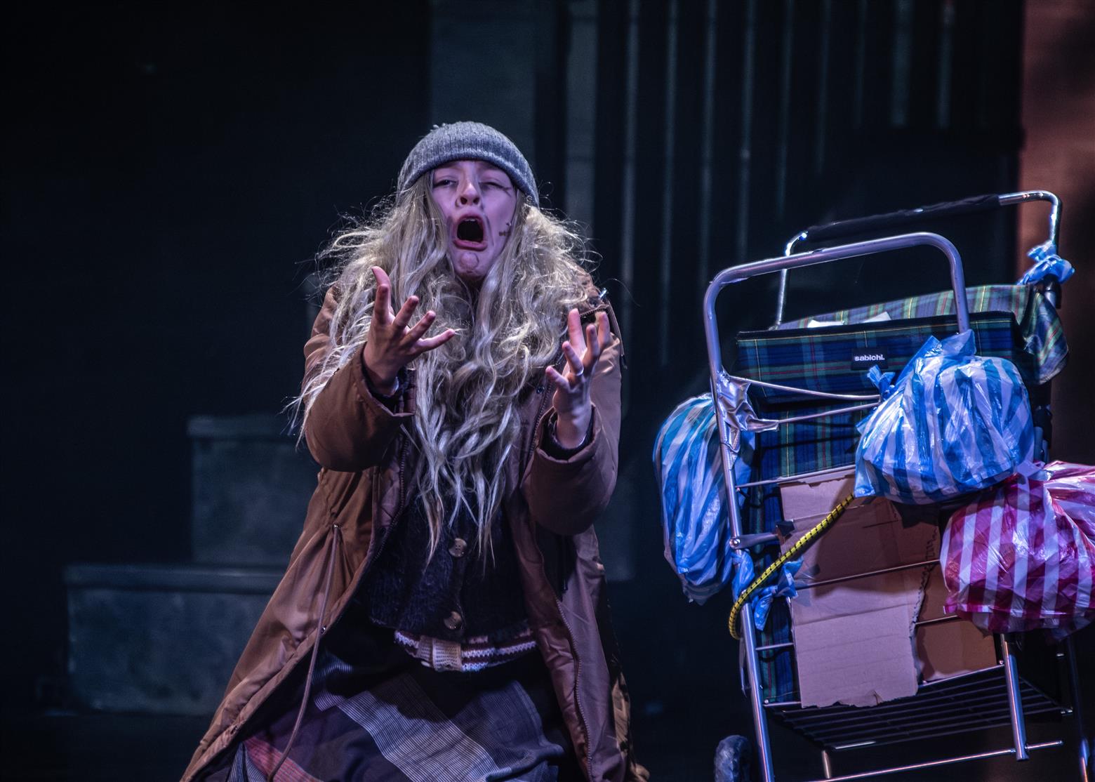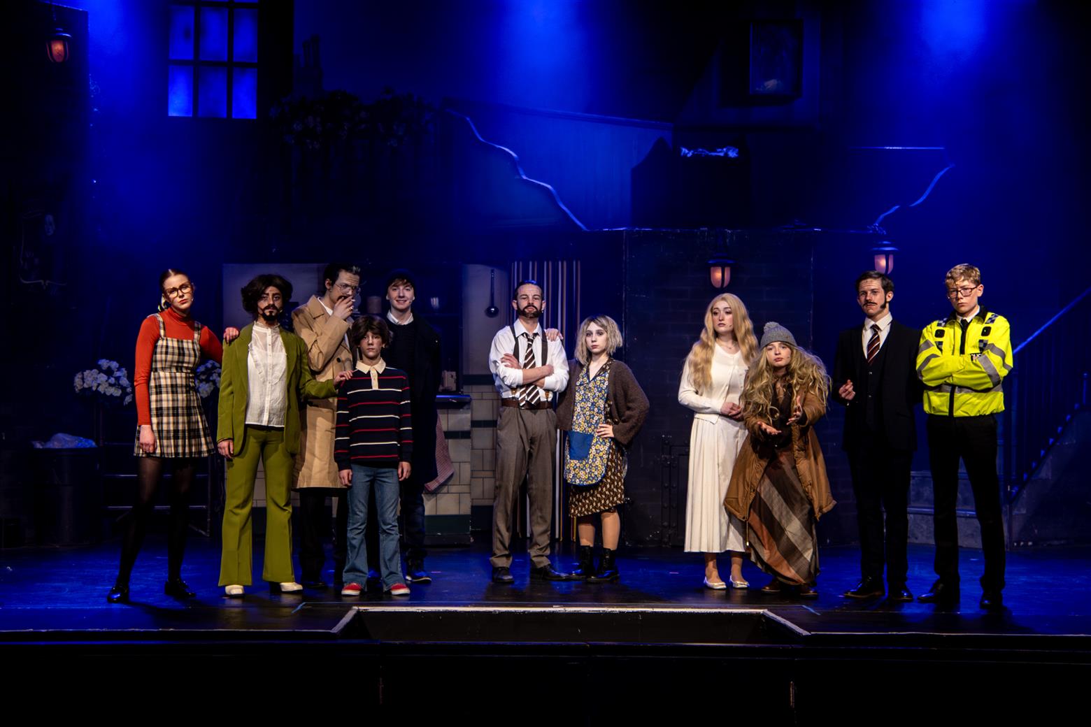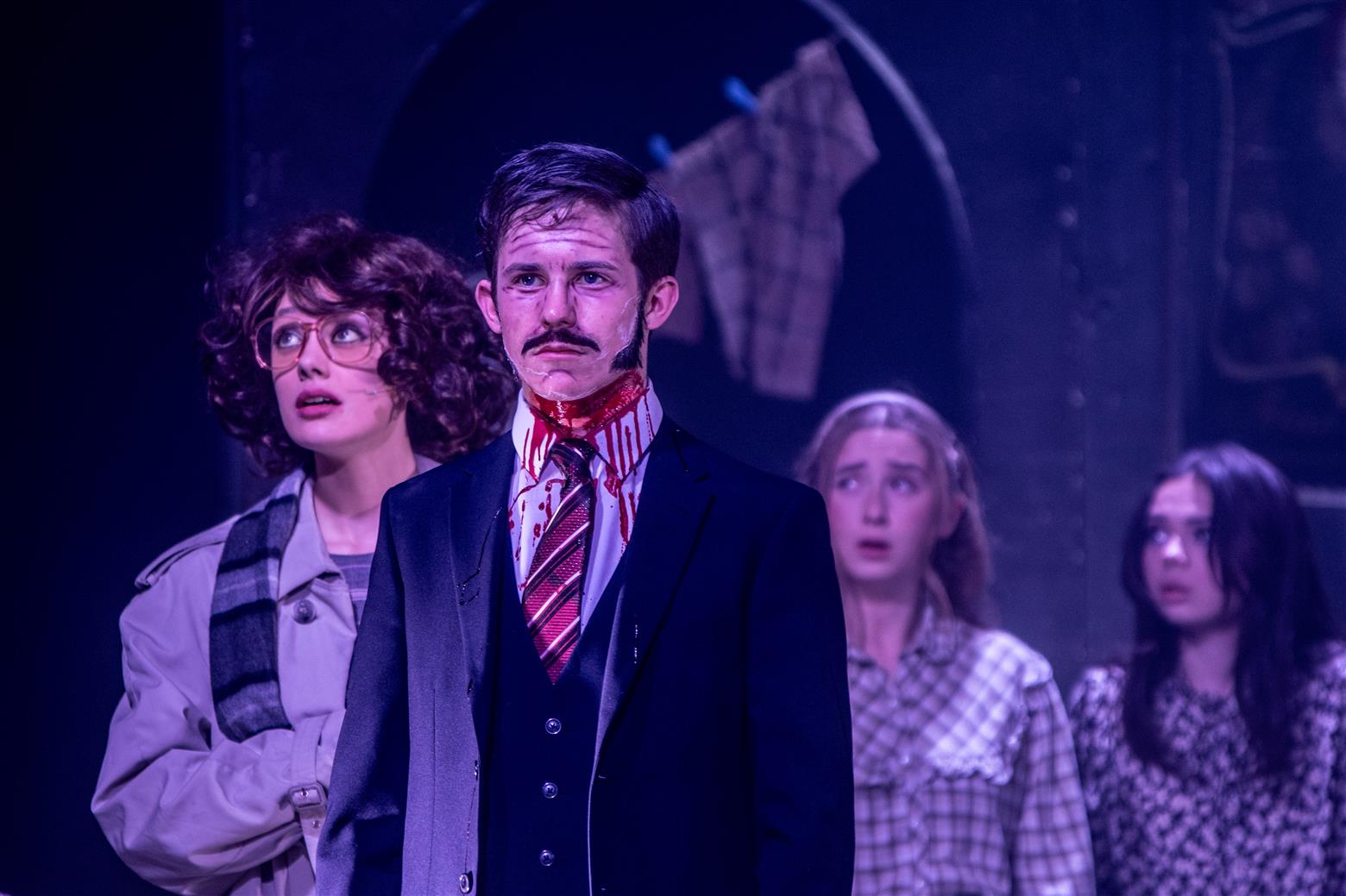 Our director, the redoubtable Miss Worthington, has provided an interesting updating to the original musical. We are first aware of this when waif-like Tobias Ragg (Elena Bleakley) melts the audience’s hearts as the little ‘lost boy’ but is dressed in jeans. Then appear policemen in modern dress, and citizens in 1970s clothes. Very realistic too. One lady was with child, and another had had one, and carried it in a sling. Later in the show, we saw the citizens gossiping about the gory murders and disappearances they were vaguely aware of - the young mother puffing away on her Players No 6 whilst she spoke to her pregnant friend. Very 1970s. The only double acts we had were Mike and Bernie Winters, or Morecambe and Wise. Health n’ Safety hadn’t been invented. It took me right back to the days of not wearing seatbelts and witch’s-hat rides on tarmacadamed park playgrounds. You might be forgiven for thinking ‘Wow. Call the Midwife’s gone very dark all of a sudden. And where’s Sister Monica Joan?’. I loved it. It took me right back to getting on board with The Double Deckers, flares and Afghan coats on Carnaby Street and ‘Treets’, melting in your mouth, not in your hand.