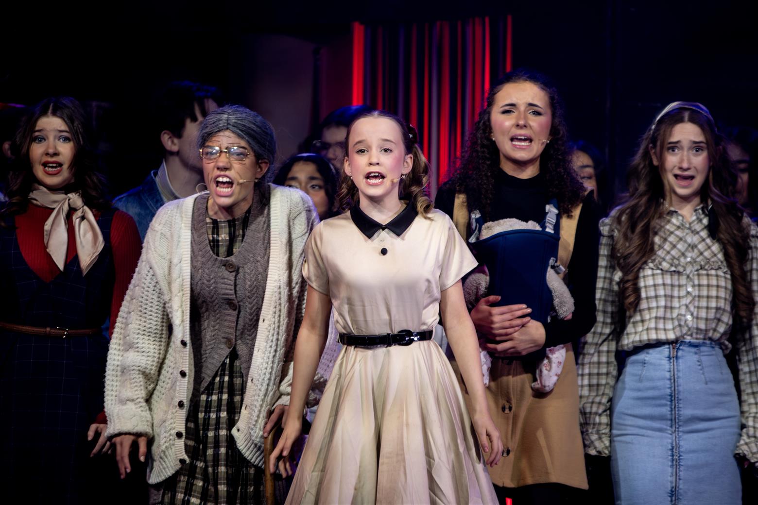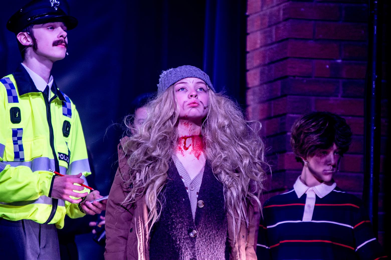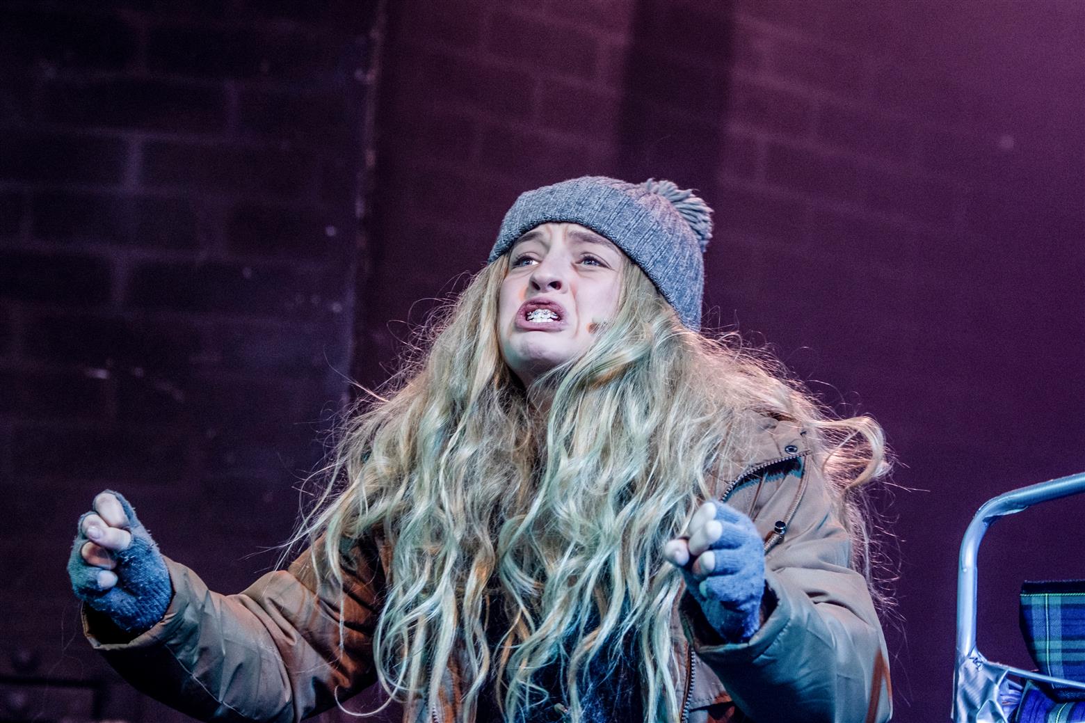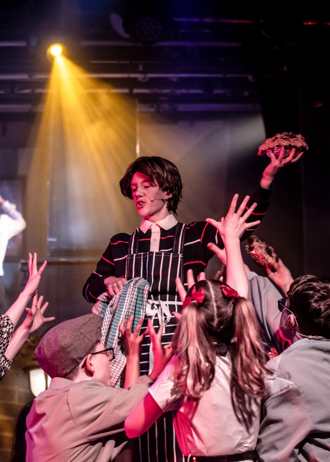 Our director, the redoubtable Miss Worthington, has provided an interesting updating to the original musical. We are first aware of this when waif-like Tobias Ragg (Elena Bleakley) melts the audience’s hearts as the little ‘lost boy’ but is dressed in jeans. Then appear policemen in modern dress, and citizens in 1970s clothes. Very realistic too. One lady was with child, and another had had one, and carried it in a sling. Later in the show, we saw the citizens gossiping about the gory murders and disappearances they were vaguely aware of - the young mother puffing away on her Players No 6 whilst she spoke to her pregnant friend. Very 1970s. The only double acts we had were Mike and Bernie Winters, or Morecambe and Wise. Health n’ Safety hadn’t been invented. It took me right back to the days of not wearing seatbelts and witch’s-hat rides on tarmacadamed park playgrounds. You might be forgiven for thinking ‘Wow. Call the Midwife’s gone very dark all of a sudden. And where’s Sister Monica Joan?’. I loved it. It took me right back to getting on board with The Double Deckers, flares and Afghan coats on Carnaby Street and ‘Treets’, melting in your mouth, not in your hand.